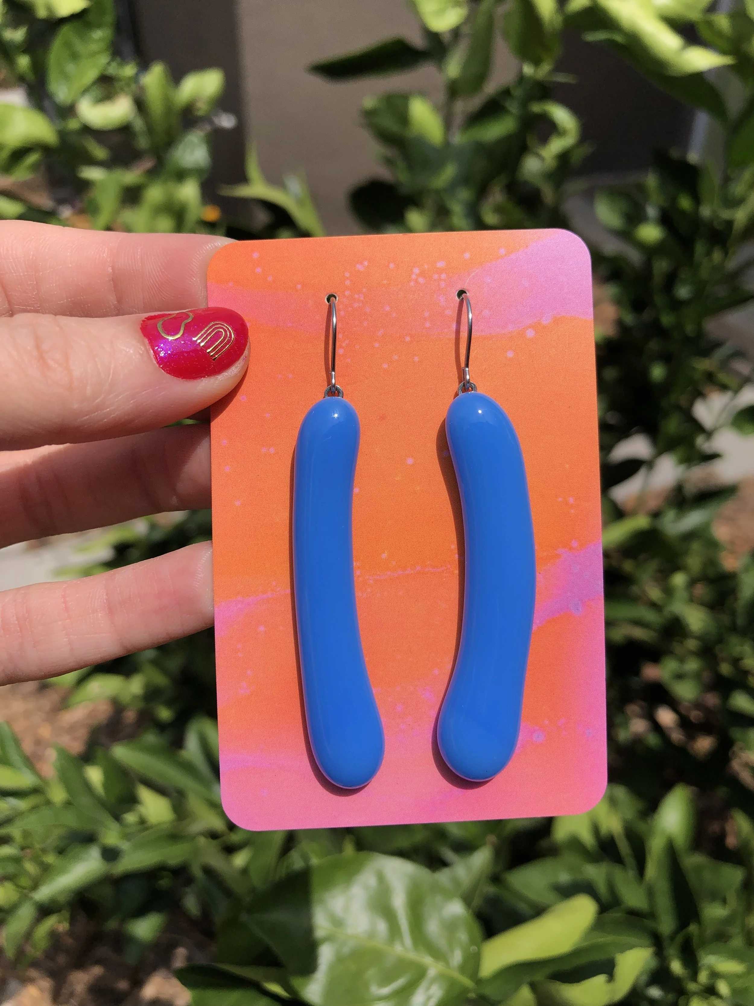 a summer version of a clumsy classic, these earrings are hand cut in organic soft curves of electric blue glass.