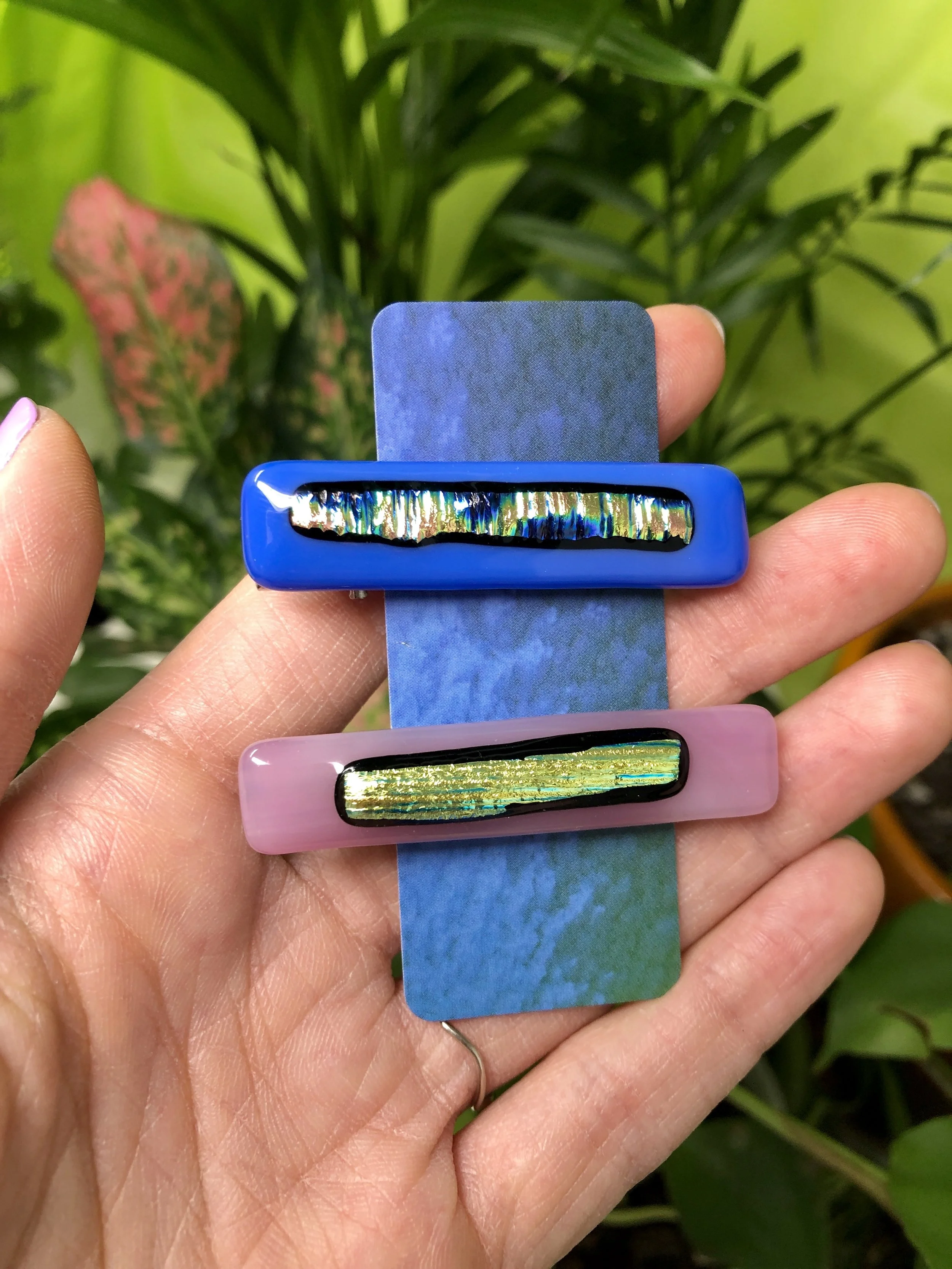 made of iridescent dichroic glass layered on contrasting solid glass, these hair clips are both otherworldly and very useful on this here earth!